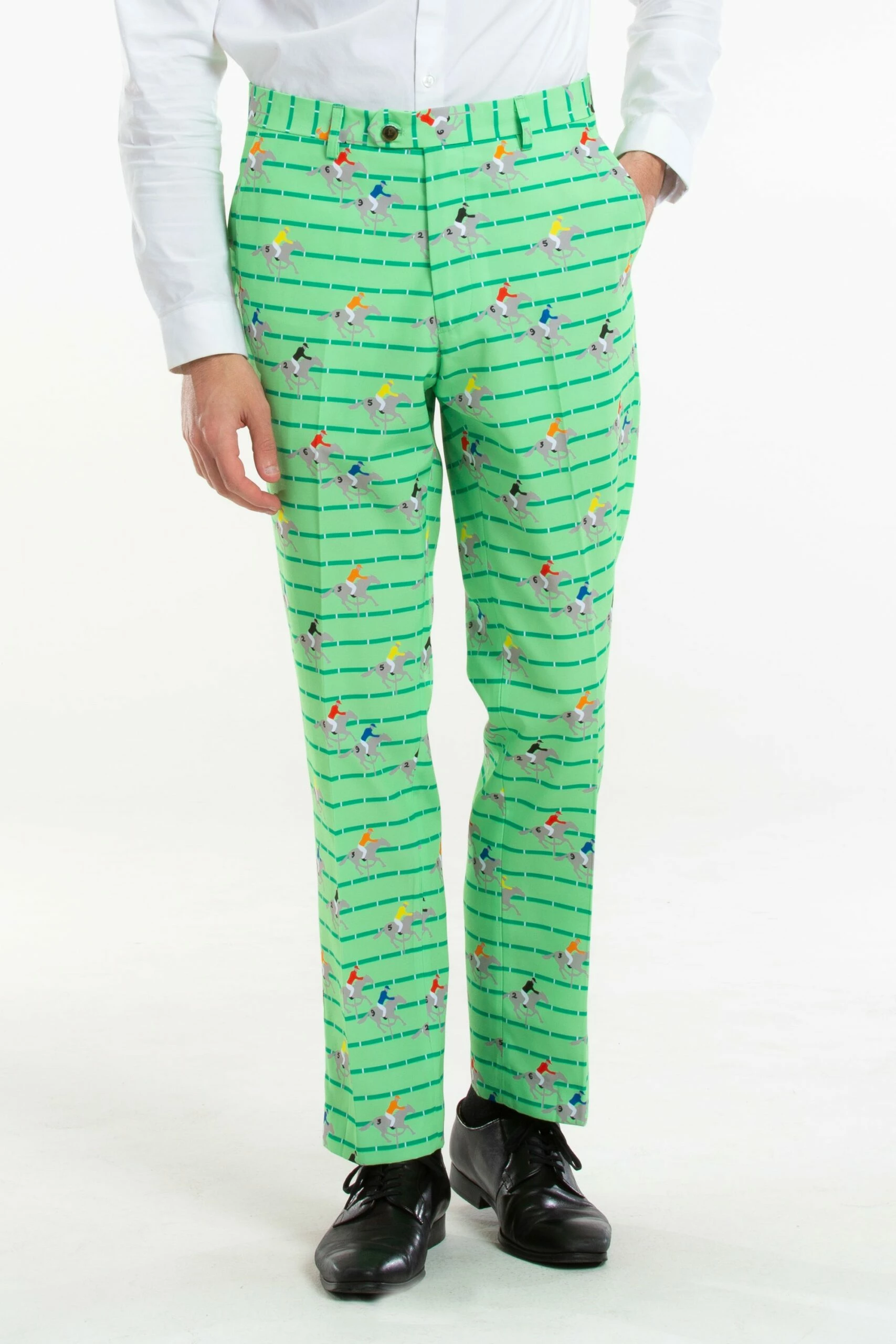 Did you know that around 120,000 Mint Juleps are served over the two day period at the Derby? Most of those bevy’s cost around $11 a pop, but, you also order one that will run you a pretty penny around $1,000. Rest assured knowing these striped suit pants pair well with either option. But if you do end up munching on crushed ice flown in from Finland…let us know how it tastes.
