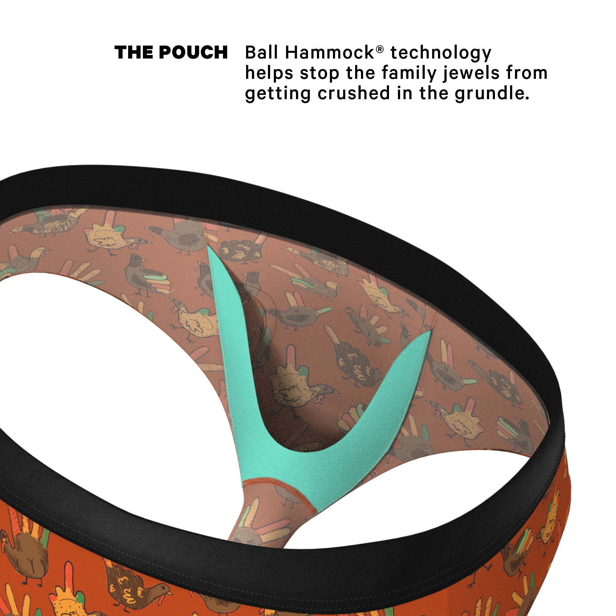 Think drawing hand turkeys is a dumb kids’ activity? Think again. These Ball Hammock® Pouch Briefs show off what a hand turkey can look like when you get a little more creative. From middle fingers to that Vulcan hand thing I can’t do, these hand turkeys are definitely worth hanging on the refrigerator.