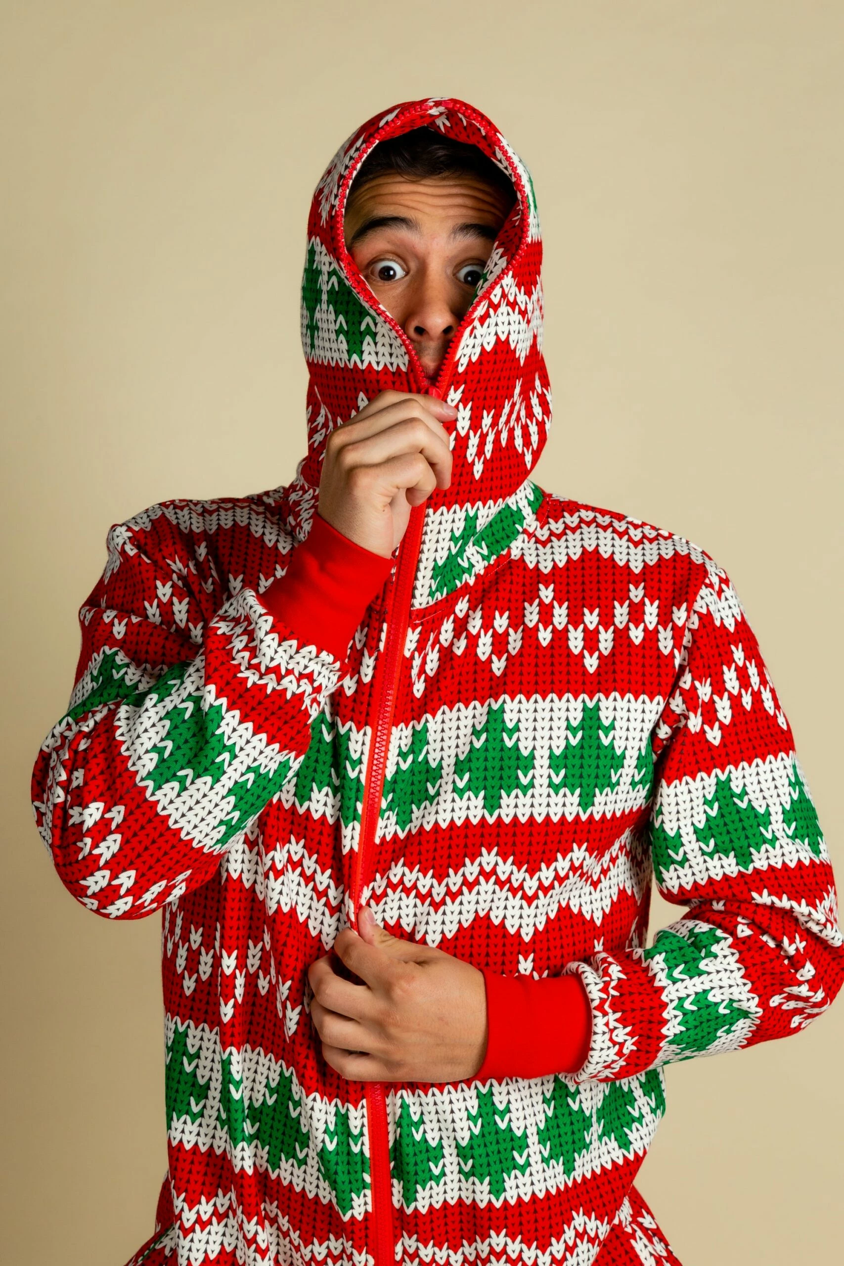 Screw the ugly sweater party, this year is all about the undeniable king: the Christmas PJ’s. Why would you choose to wear a hand-me-down mothball sweater when you could show up to the party in complete comfort in this big zip red Christmas onesie? Get ready to drop to your knees for peppermint patty shots with a sweet candy cane chasers. This classic red and green knit print onesie is the newest life of the party.